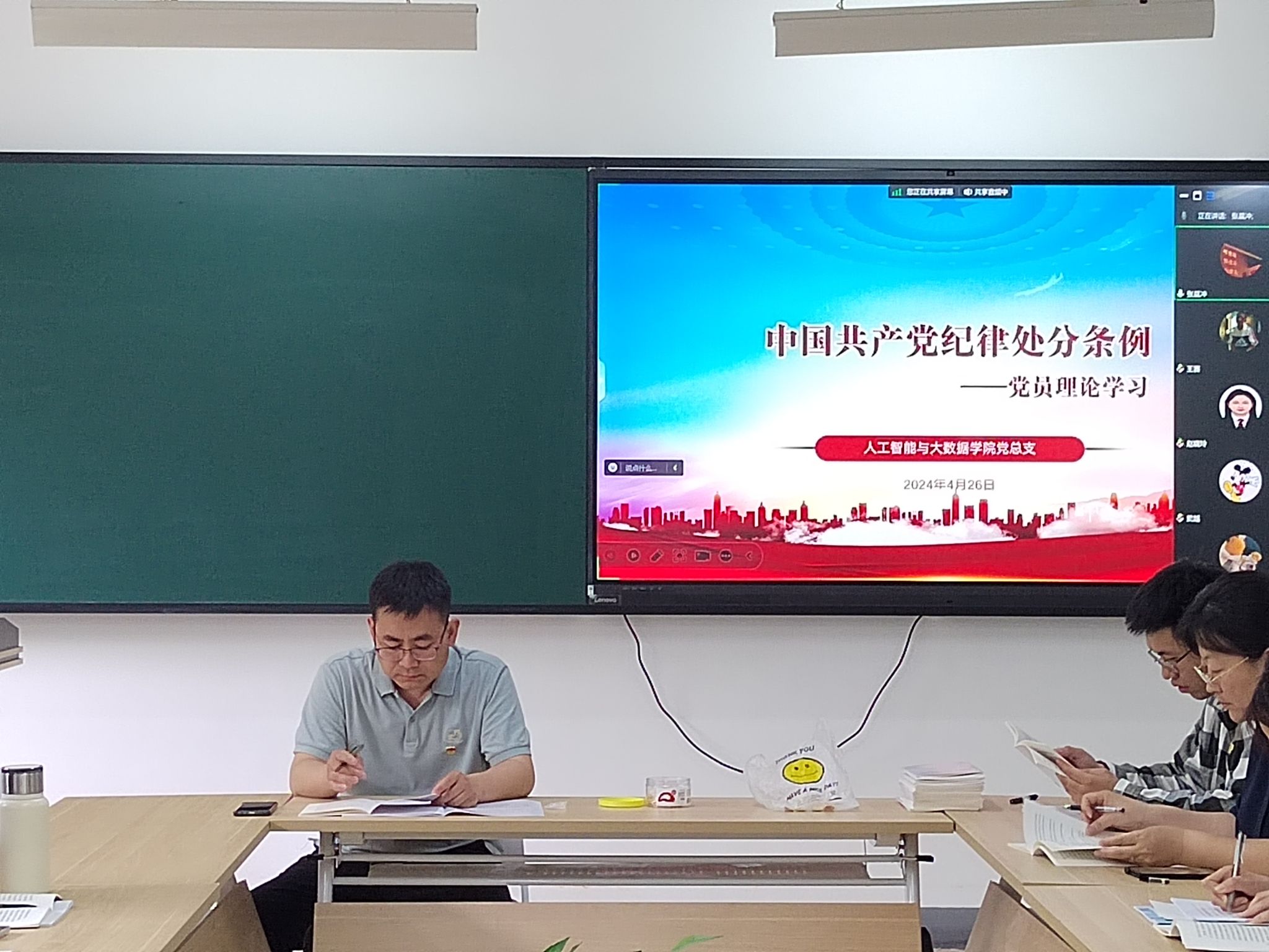 2024年4月26日下午13:30,人工智能与大数据公司党总支以支部为单位,在次教216会议室召开了党员理论学习专题会议,本次会议由人工智能与大数据公司党总支书记、学管副经理尹钧主持召开,参与人员有教工支部和员工支部全体成员,线上和线下同时进行。