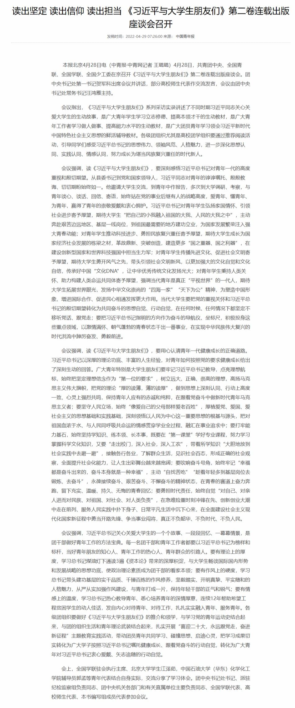 共青团中央、全国青联、全国学联、全国少工委在京召开《习近平与老员工朋友们》第二卷连载出版座谈会。团中央书记处第一书记贺军科出席会议并讲话,部分高校师生代表作交流发言。