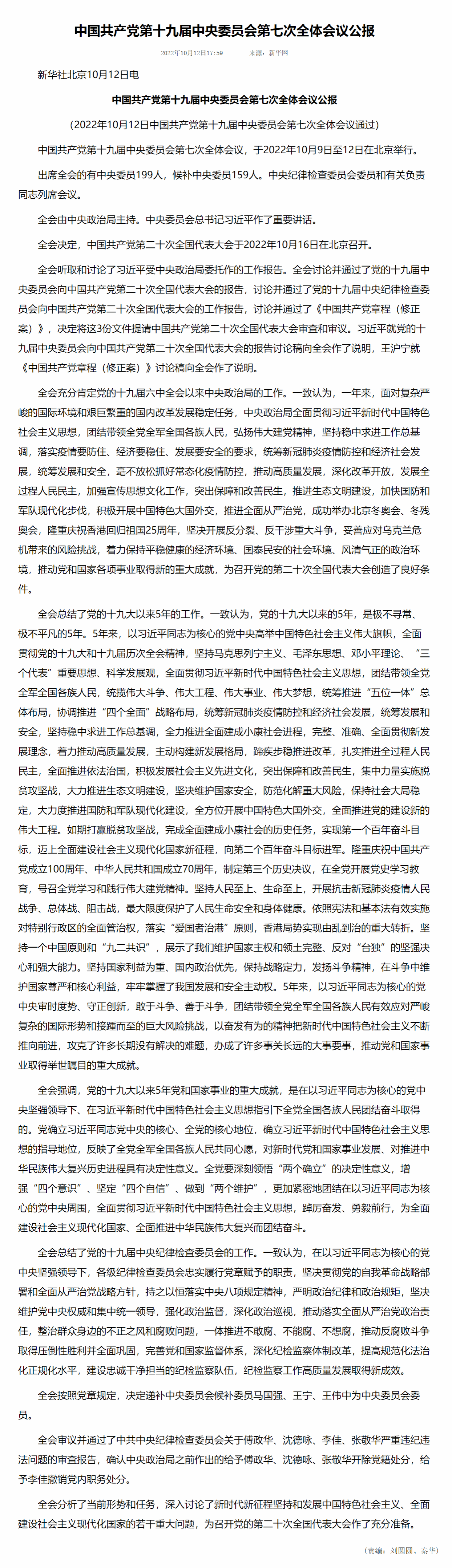 中国共产党第十九届中央委员会第七次全体会议,于2022年10月9日至12日在北京举行。出席全会的有中央委员199人,候补中央委员159人。