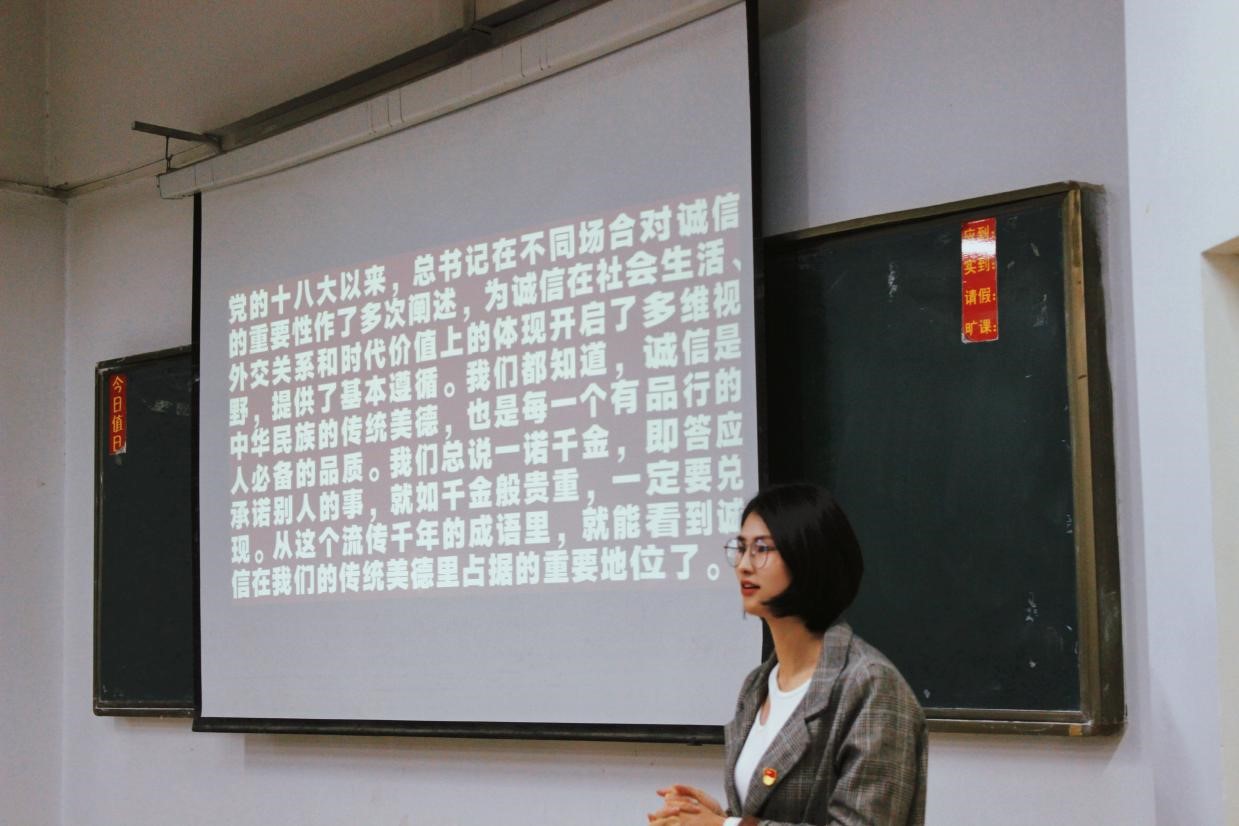 诚实守信是为人之本,为培育和践行以社会主义核心价值观为核心,大力弘扬诚信文化,切实提升员工的诚信品质,增强自律意识和社会责任感,太阳成集团tyc122ccvip官网入口于2022年3月14日晚7:30在主教1-2教室召开关于“诚信基石,弘扬风采”主题团课,本次主题团课由团总支书记苗璋寒老师主持,各社团负责人以及大一各班班长、团支书参加。