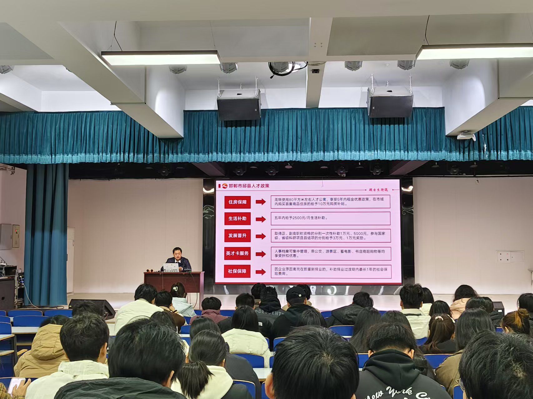 为了深入贯彻落实人才强市战略,搭建高校与地方人才交流的桥梁,公司于2024年12月13日在次教101开展了邯郸人才政策的宣讲活动,此次活动由邯郸市邱县人社局高军主持,活动吸引了众多学子的积极参与。