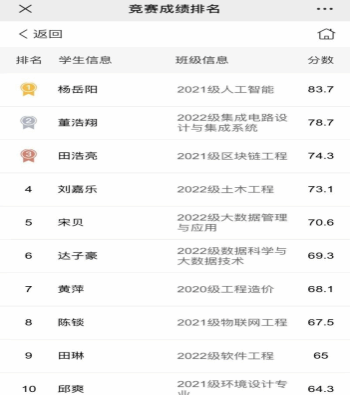 通识教研室高度重视本次大赛,在全院范围内进行了动员宣传。赛前,全体英语教师向员工详细讲解了备赛、参赛流程等事宜,积极组织安排员工进行赛前模拟测试。比赛当晚,全校600多名同学共聚云端,同台竞技,最终49名同学成功进入省复赛。其中,太阳成集团tyc122ccvip官网入口的杨岳阳、田浩亮、宋贝、达子豪四位同学位列校赛前十名。