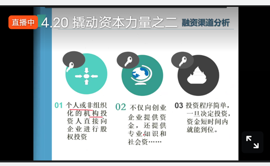 活动正式开始前,老师先让员工准备一个关于创新创业的故事并在讲台前向大家分享,目的是为了让员工们学习他人的成功经验与创新创业精神并且锻炼员工的口语表达能力。员工们也都积极的参与其中,课堂的表现氛围良好,老师将自己的知识传授给员工,员工不断学习来弥补自己在这些方面的不足之处,加强这些方面的能力和水平。本堂课吴老师主讲撬动资本力量这一节,首先讲述了融资渠道的来源,融资渠道可以由个人或非组织化的机构投资人直接向企业进行股权投资,创业企业提供资金,还提供专业知识和社会资金,投资程序简单一旦决定投资,资金短时间内就能到位。最后还为我们讲解了在投资之前的大量准备工作。本次活动让同学们受益匪浅,而活动则在热烈的掌声中结束。