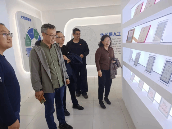 韩明教授和平文举先生在实训楼先后参观了百度区块链实验室、虚拟现实技术展厅、科大讯飞展厅。孙经理简要介绍了数智公司的整体发展情况,并把公司各专业的课程体系建设、实验室建设、员工校外实习基地建设等情况向韩明教授和平文举先生进行介绍。