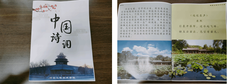 团队成员来到了兴隆县车河梁村,在这里我们为村里的孩子们讲述了中华的诗词,向他们宣传中华传统文化,增强文化自信。在宣讲之前我们利用自己的专业知识和艺术技巧,将农村地区的历史、传统和承德历史中出现的诗词制作成“诗词册”,方便员工们学习。
