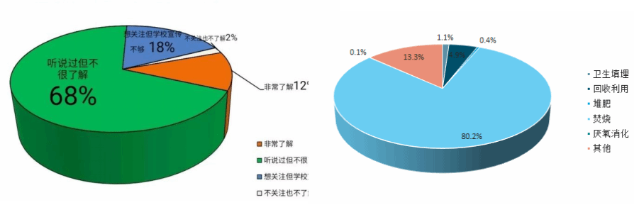 此次调研了解到当地共有1座生活垃圾填埋场、3个垃圾处理站、5个垃圾分类回收站,目前的生活垃圾均运至区生活垃圾卫生填埋场进行无害化处理;经过入户调查和问卷调查发现68%的村民和商家小贩对于垃圾分类处理工作听说过但不很了解,18%的村民表示接受过垃圾分类知识的宣传活动,但大多数都只停留在表面,并没有深入的去学习如何分类,12%的村民和商家小贩对于垃圾分类处理工作是非常了解,且大力支持此项国家政策,还有2%的村民既不关注也不了解。