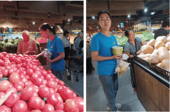 队员帮助老人选购食材