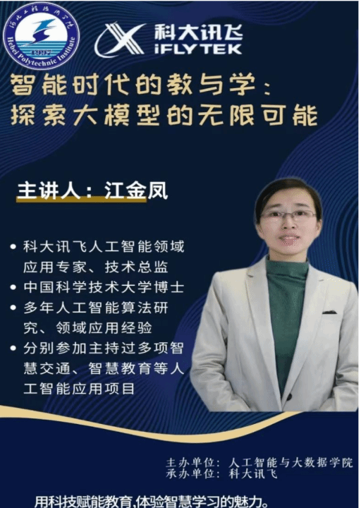 本次讲座将邀请科大讯飞企业中最具权威的专家江金凤博士,与员工们就大模型的发展历程、应用场景和未来趋势等方面进行深入探讨。同时,还将邀请多位业界专家分享他们在大模型应用方面的实践经验和创新思路,为广大师生提供一场思想盛宴和学术交流的平台。本次讲座的主题是“智能时代的教与学:探索大模型的无限可能”,旨在探讨大模型在智能时代的应用和未来发展,为广大师生提供前沿的学术研究和实践经验,促进人工智能与公司产品的深度融合。