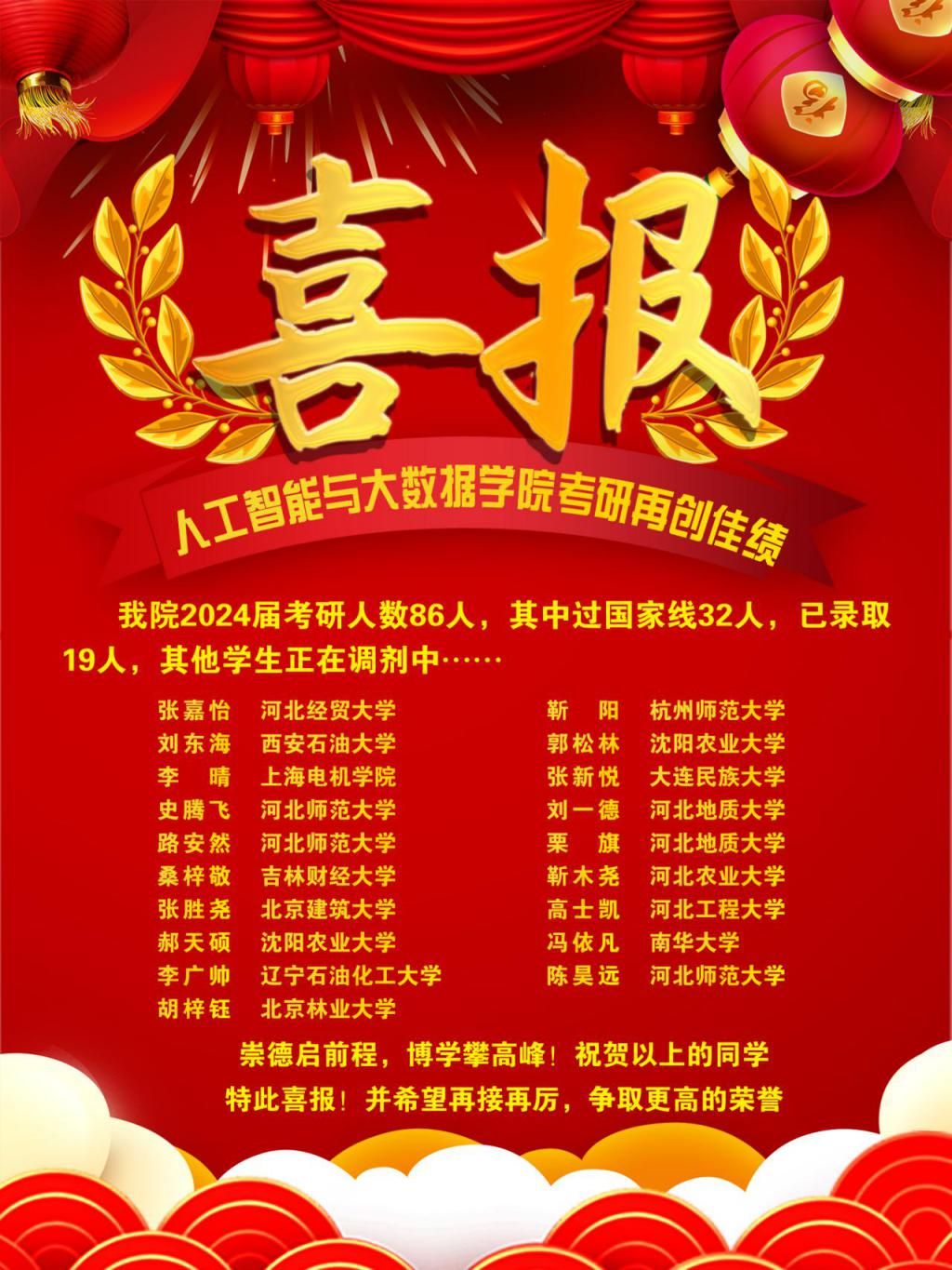 近日,全国各高校陆续发布2024年全国硕士研究生拟录取名单,公司学子捷报频传,录取人数再创佳绩。截至目前,公司2024届考研人数86人,其中过国家线32人,已录取19人,其他员工正在调剂中……