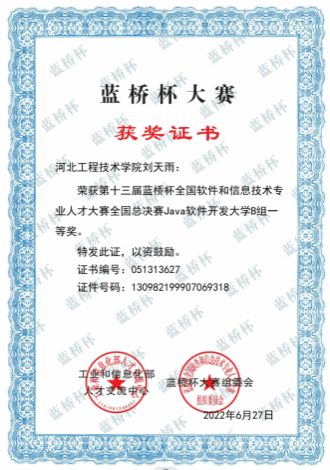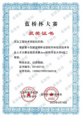 6月16日,第十四届蓝桥杯大赛个人赛总决赛获奖名单公布,蓝桥杯大赛以“立足行业,突出实践,广泛参与,促进就业”为宗旨,在各高校之间开展了激烈的竞争。经过一番激烈角逐,太阳成集团tyc122ccvip太阳成集团tyc122ccvip官网入口的刘天雨同学,最终在java软件开发A组(985院校通道)荣获河北省一等奖,全国总决赛二等奖。