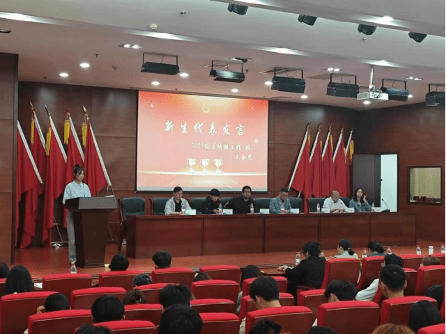 新生代表23级区块链1班王静思同学上台发言,她提到“大学 ,是自主的开始,是梦想的开端,是迈上新征程的见证。新的生活需要我们积极地发挥主动性,去探索,去体验”。
