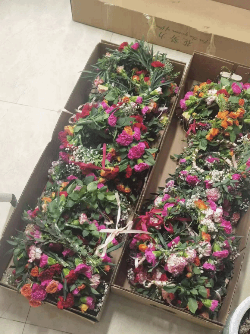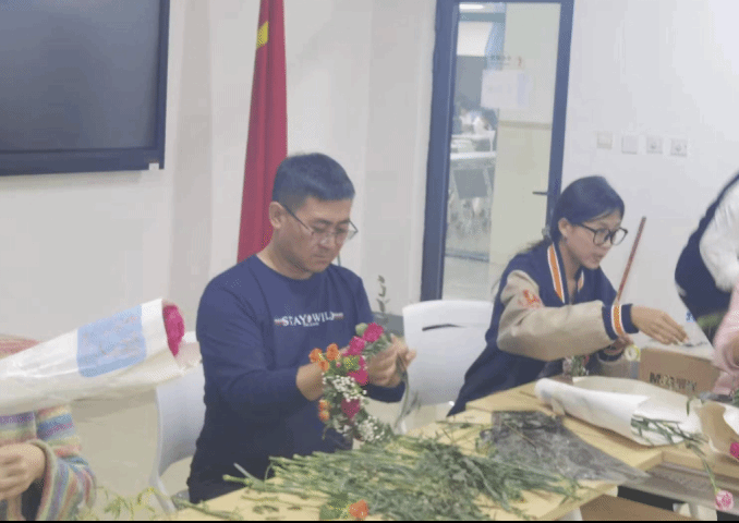 每个成员密切合作,互相帮助,充分展现了公司师生之间的团结和默契。整个筹备过程中,尹经理始终亲力亲为,帮助同学们解决问题,指导他们的工作。他不仅在挑选鲜花和绿植时给予同学们建议,还亲自动手裁剪和编织花环,带领同学们共同完成了一道道精美的花环。整个过程充满了欢声笑语和活力四溢的氛围。同学们一边互相交流,一边认真装饰,彼此之间不断地分享着自己的想法和灵感。这种合作和分享的精神使得每个小组的花环都独具特色。这些花环不仅色彩鲜艳、形状各异,更是展现了公司师生的创造力和艺术才华。