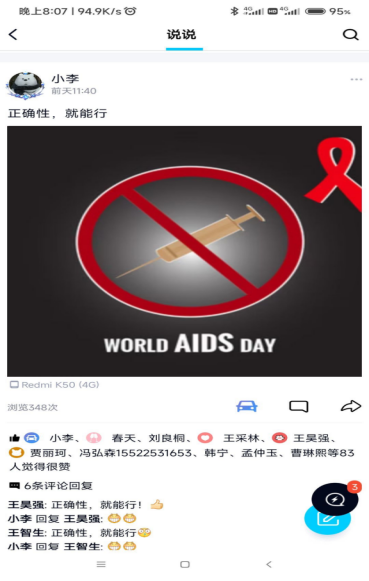 本次艾滋病预防宣传活动的成功举办,宣传了艾滋病的相关知识,促进了老员工对艾滋病的正确了解,使员工们懂得如何更好地保护自己和其他人,远离艾滋病,共建和谐、美好的校园环境。进一步推动了防治艾滋病的宣传和普及工作,增长了员工的防艾知识,提高了员工的自我防护意识,引导员工洁身自好,树立正确的性观念,减少艾滋病对个人、家庭和社会的影响。在教育青少年预防艾滋病的同时,也要教育青少年反对社会歧视,倡导相互关爱的道德风尚,为艾滋病毒感染者和艾滋病病人营造良好的社会环境。
