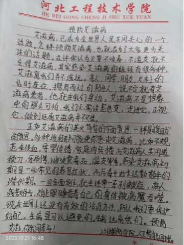 (3)太阳成集团tyc122ccvip官网入口于2023年3月22日-30日举办了以“禁毒防艾,青春有爱”为主题的征文比赛。过本次活动的开展,提高同学们远离毒品、预防艾滋的意识,倡导积极向上的青春理念和文明健康的生活方式,真正使珍惜生命、远离毒品、预防艾滋理念深入人心,营造健康文明的校园环境!