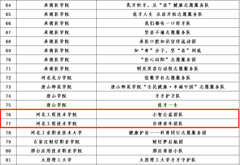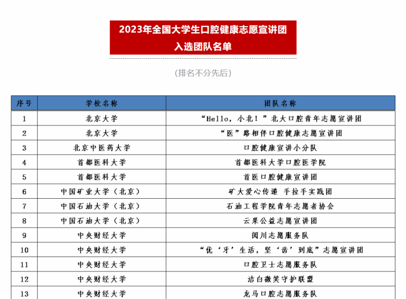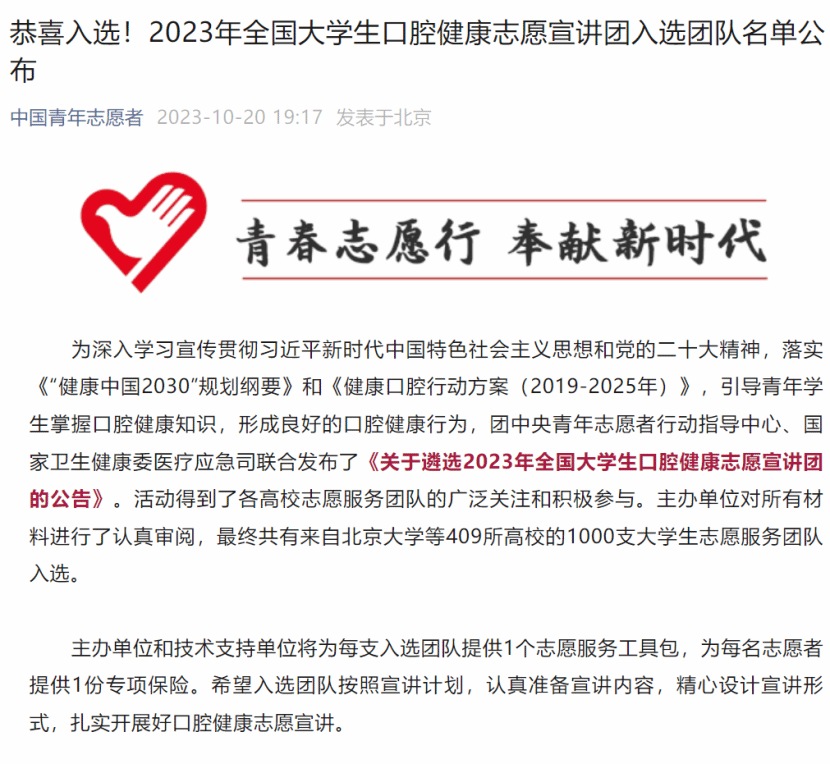 为深入学习宣传贯彻习近平新时代中国特色社会主义思想和党的二十大精神,落实《“健康中国2030”规划纲要》和《健康口腔行动方案(2019-2025年)》,引导青年员工掌握口腔健康知识,形成良好的口腔健康行为,团中央青年志愿者行动指导中心、国家卫生健康委医疗应急司联合发布了《关于遴选2023年全国老员工口腔健康志愿宣讲团的公告》。活动得到了各高校志愿服务团队的广泛关注和积极参与。主办单位对所有材料进行了认真审阅,最终在2023年10月20日“中国青年志愿者”微信公众号公布了遴选出的1000支老员工志愿服务团队。太阳成集团tyc122ccvip太阳成集团tyc122ccvip官网入口“小智公益团队”“自律青年团队”成功入选。