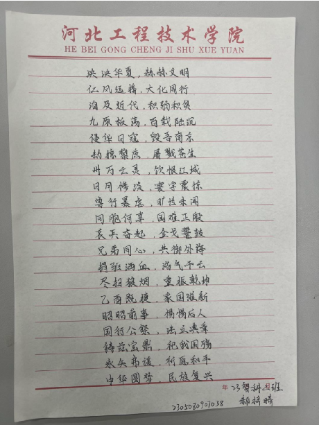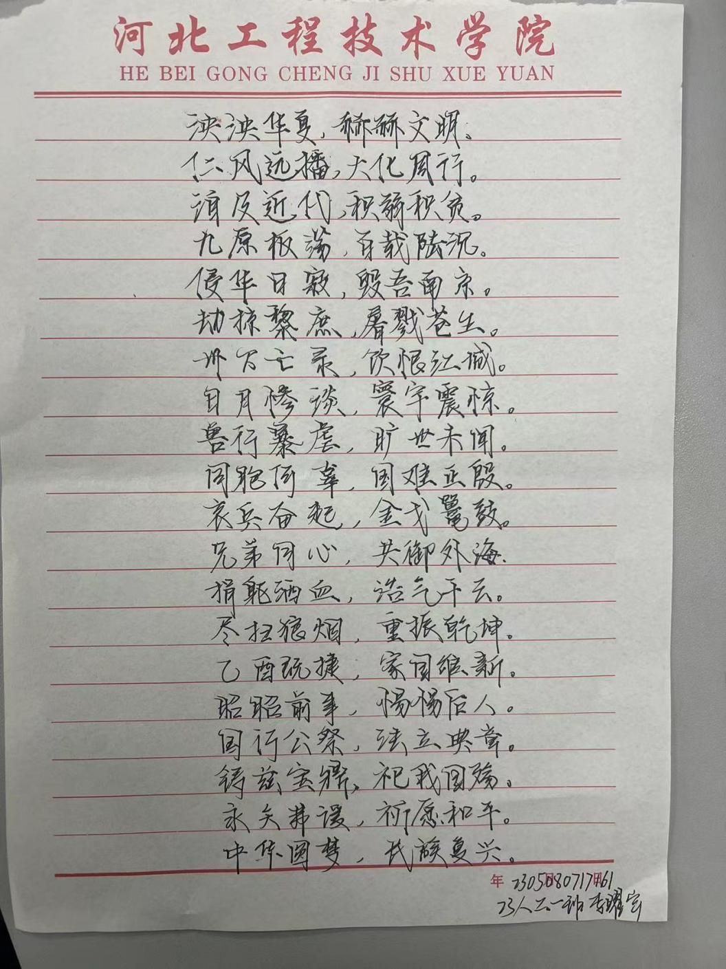 此次活动在线下举办,由工作人员对参加活动的员工进行公祭日的科普宣讲,内容包括国家公祭日的历史背景,先烈们的英雄事迹,以及设立公祭日的重大意义。整个宣讲内容讲述着中华民族的苦难历史,提醒着员工们应该铭记历史、勿忘国耻。宣讲结束后,员工们根据本次公祭日主题在纸上用心写下充满敬意的书法作品,表达对逝去英烈的无限缅怀。活动过程中,员工们保持良好的秩序,现场寂然无声,每个人都保持着崇高的敬意。随后,在规定时间之内完成作品上交给工作人员。书法作品上交后,由工作人员进行统计并赋分。