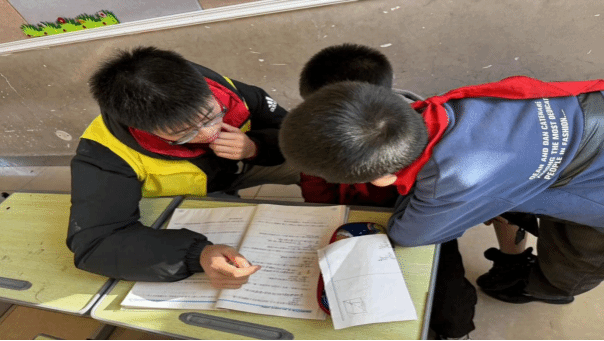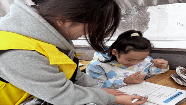 志愿活动中志愿者辅导小员工们课后作业,解决员工们的问题,缓解员工学习压力,积极与同学们沟通交流,共同营造良好的学习环境。