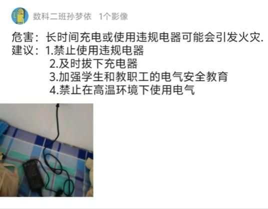在本次活动中,员工们积极参与,化身“安全侦探”,深入校园各个角落,捕捉那些可能存在的安全隐患。这些隐患包括电线老化、消防通道堵塞、违规使用电器等等。每一张照片都配有详细的文字说明,不仅展示了隐患本身,还提出了切实可行的整改建议,体现了员工们对校园安全的深刻认识和高度责任感。为了确保活动的顺利进行,工作人员创建了一个专门供参与人员们沟通交流的QQ群,员工们在群内分享自己的摄影作品,共同探讨如何更好地提升校园安全水平。