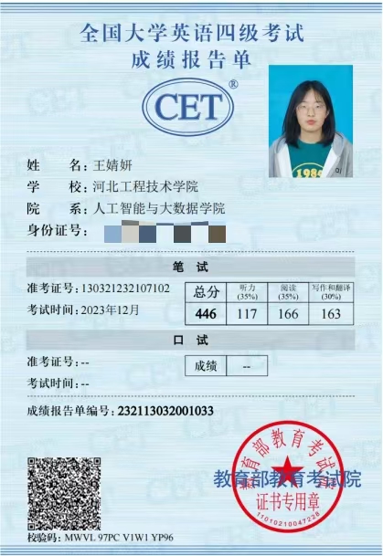 2023年获普通话水平测试等级证书;2024年获大学英语四级证书。
