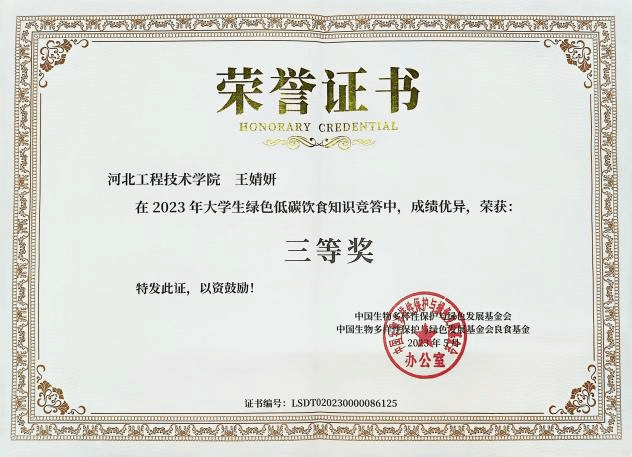 2023年荣获老员工绿色低碳饮食知识竞答三等奖。