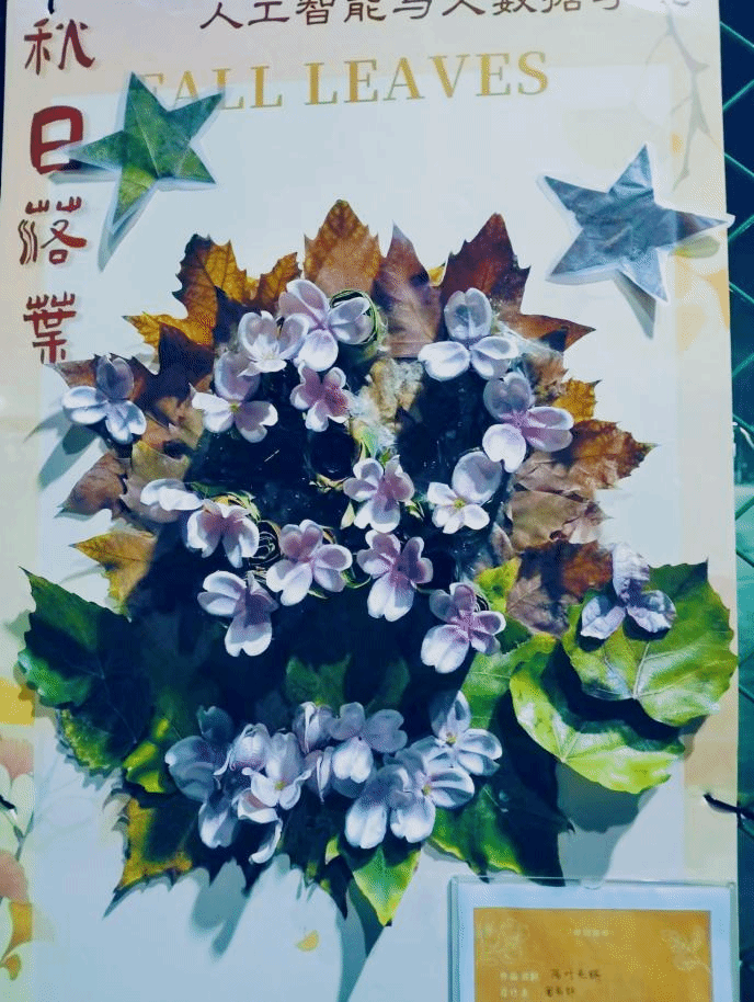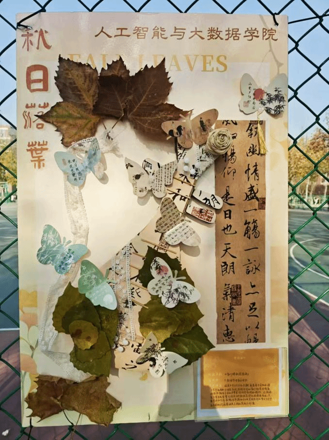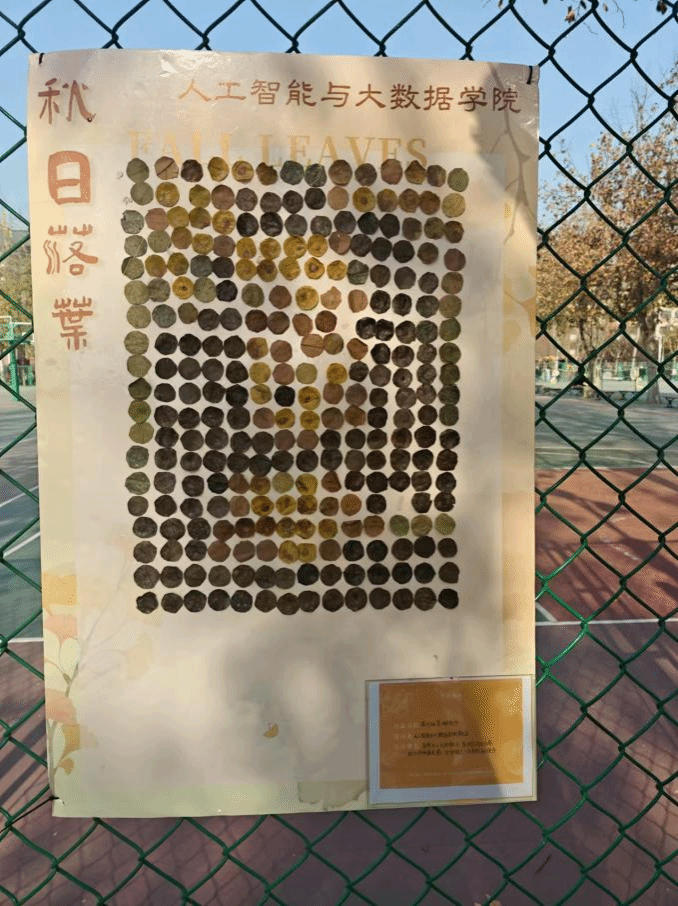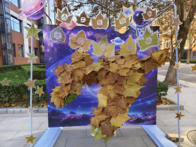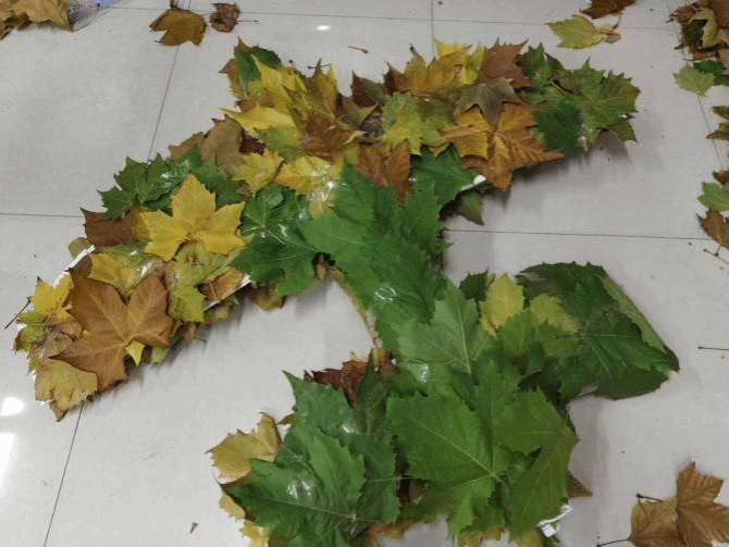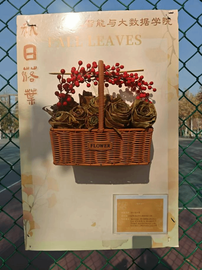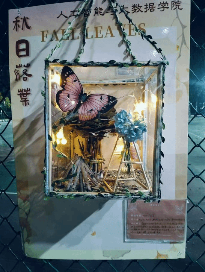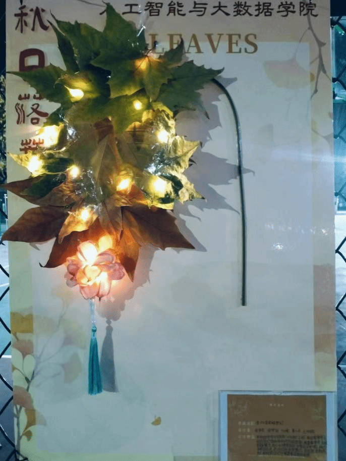 员工们发挥无尽创意,对落叶进行精心裁剪,巧妙拼凑制作出一幅幅精美的图案,展板右下标注了设计者的设计理念及作品名称。用落叶制作的花篮,散发着浓郁的田园气息与古朴韵味;发光的蝴蝶灯笼,宛如一群闪耀着奇异光芒的精灵在夜色中翩翩起舞;落叶版蒙娜丽莎,一片片耐心地拼凑出她那神秘而迷人的面容、优雅的身姿散发着古典艺术的庄重与深沉;一个福字传达出对幸福生活的向往、对美好未来的期盼;古风落叶琵琶的造型,仿佛能听到悠扬的古乐从历史的深处传来,令人沉醉在那源远流长的文化长河之中……