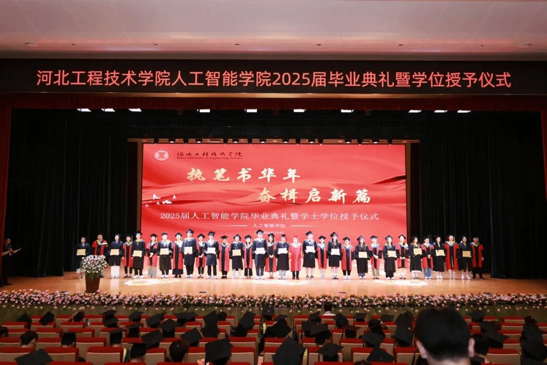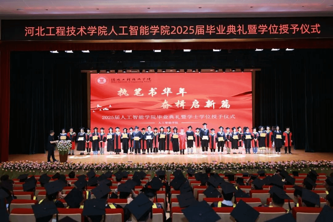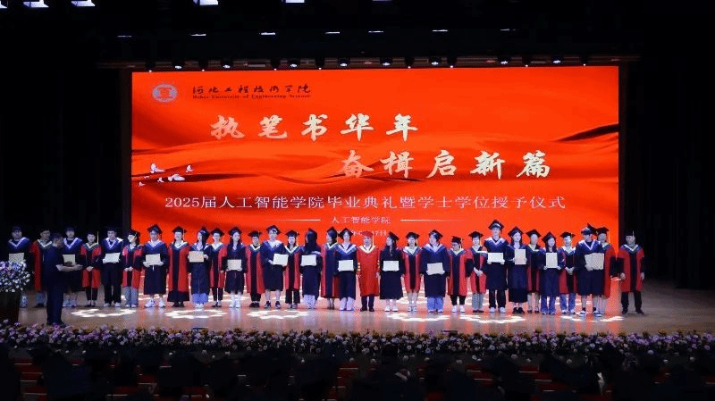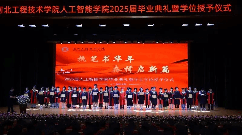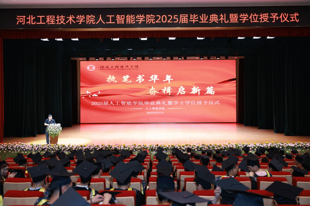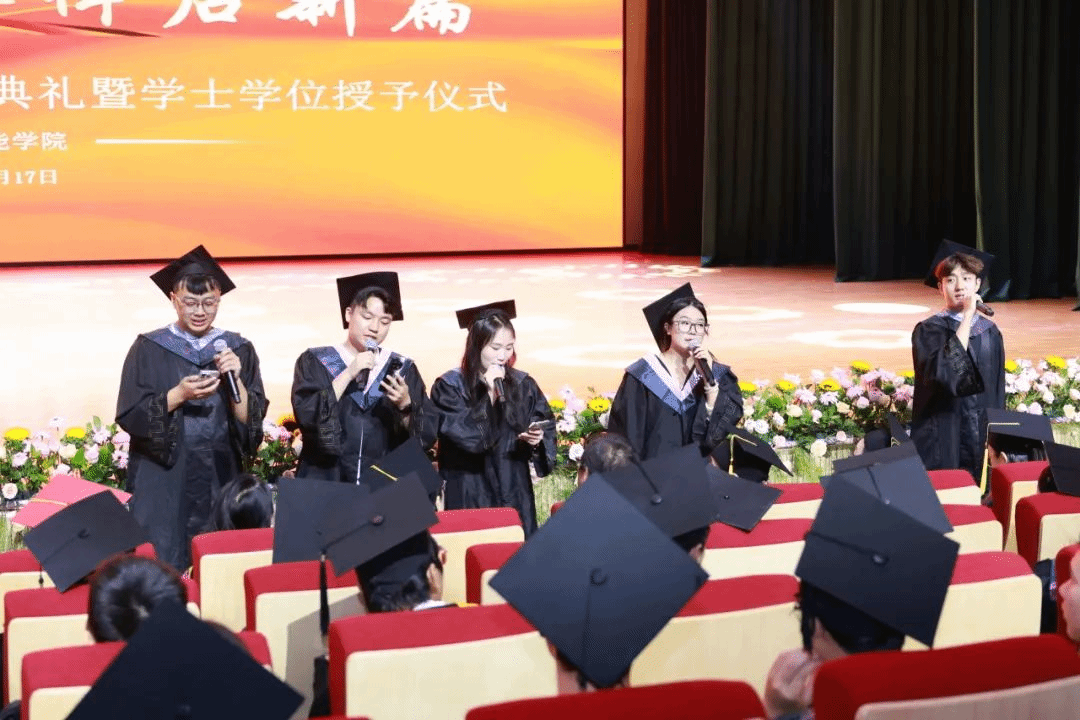 礼堂内灯光璀璨,学位服的垂穗如金色的浪花,涌动着青春的炽热与憧憬。典礼由尹经理主持,以“执笔书华年,奋楫启新篇”为主题,串联起四年时光的点滴感动与未来征途的殷切期许。