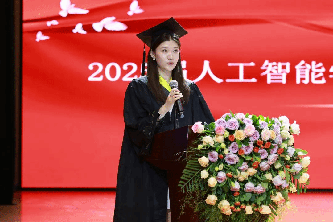 毕业生代表刘佳昕的发言如同一封写给四年青春的情书。“记得大一时在实验室第一次成功运行代码的雀跃,记得备战‘互联网+’大赛时团队连续72小时的坚守,公司的每一寸土地都生长着我们的成长密码。”他特别提及在“产教融合”项目中,企业导师手把手教学的场景,“那种理论与实践碰撞的火花,让我们真正懂得了‘知行合一’的分量。”并以“三个感谢”串联起毕业心绪:感谢导师在毕设瓶颈期“一句点醒梦中人”的点拨,感谢同窗在考研路上“互为星光”的陪伴,更感谢公司“让我们在人工智能的蓝海里敢想敢闯”。他们的发言里,藏着所有毕业生的共同记忆——那些在代码世界里披荆斩棘的日子,终将成为驰骋未来的铠甲。