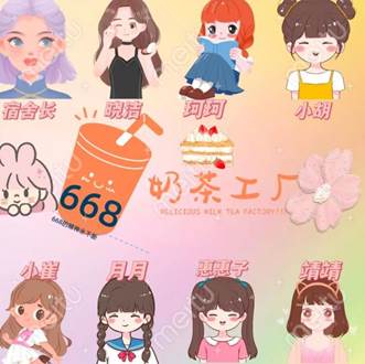 设计理念: Logo的整体设计主要为可爱、清新与活泼。中间的文字设计是因为宿舍里每个人都喜欢喝奶茶,有时却因为“穷”买不起,所以宿舍成员想一起开一家奶茶店;每个人都用卡通人物代替,每个卡通人物也展现了每个人的特点,人物上的文字正是我们在宿舍的称呼,更展现了我们668寝室活泼有趣的氛围。