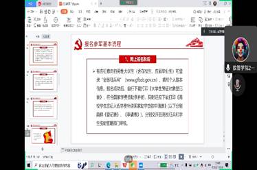 本次会议主要为大家讲解征兵入伍的一些政策和福利,秦冰松同学是2018年高中毕业参军入伍两年然后退伍回到公司,以自己的亲身经历给大家做分享。首先秦冰松为大家讲解了参军入伍的基本条件,包括身体条件、年龄要求和政治要求,要符合所有的条件才能当兵入伍,然后就是介绍了报名参军的基本流程,如网上报名,初检初审,体检政审等流程。帮助同学们更进一步的了解了参军的一些事项,然后进一步了解了入伍保留学籍的政策、学费补贴、考军校提干等一系列优惠政策。还有大家比较关注的退役之后的安置问题。通过本次的讲解帮助同学们解开了很多不惑,使同学们对参军入伍的政策有了更深的了解,鼓励同学们积极认真对待应征入伍。