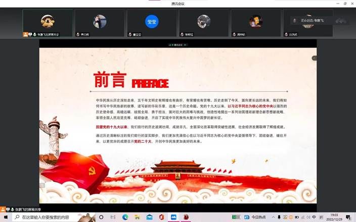 本次宣讲中,张鹏飞老师首先介绍了党的二十大的会议主题,同时带领员工们全面了解了党的二十大召开进程、党的二十大会议议程、党的二十大报告内容。然后张鹏飞老师通过介绍两个“极不”,三件大事和六个坚持,简单地讲述了过去五年的工作和新时代十年的伟大变革。习近平总书记和中国共产党人初心不改、始终如一。新时代的伟大成就是党和人民奋斗出来的,青年是祖国的未来和希望,广大青年应该肩负历史使命,在新时代谱写新篇章。