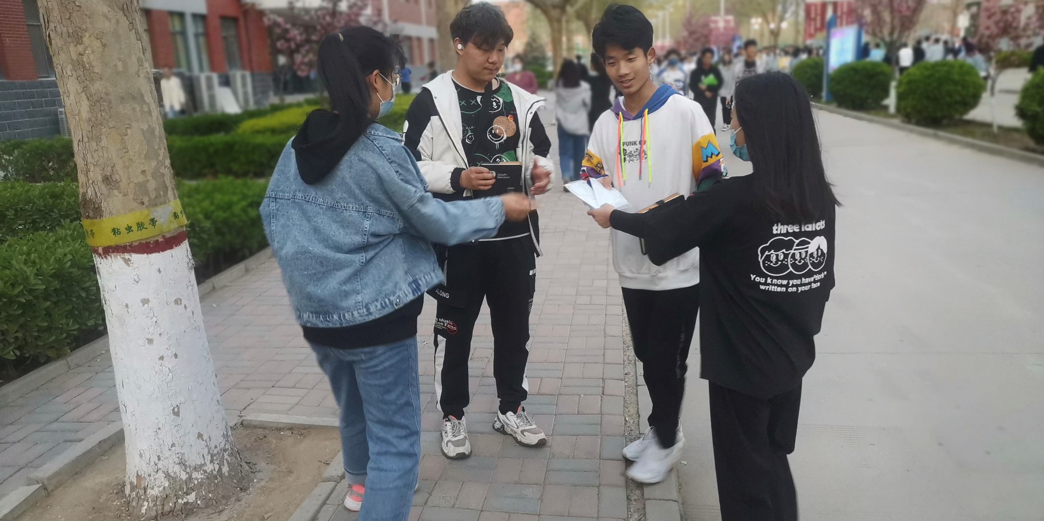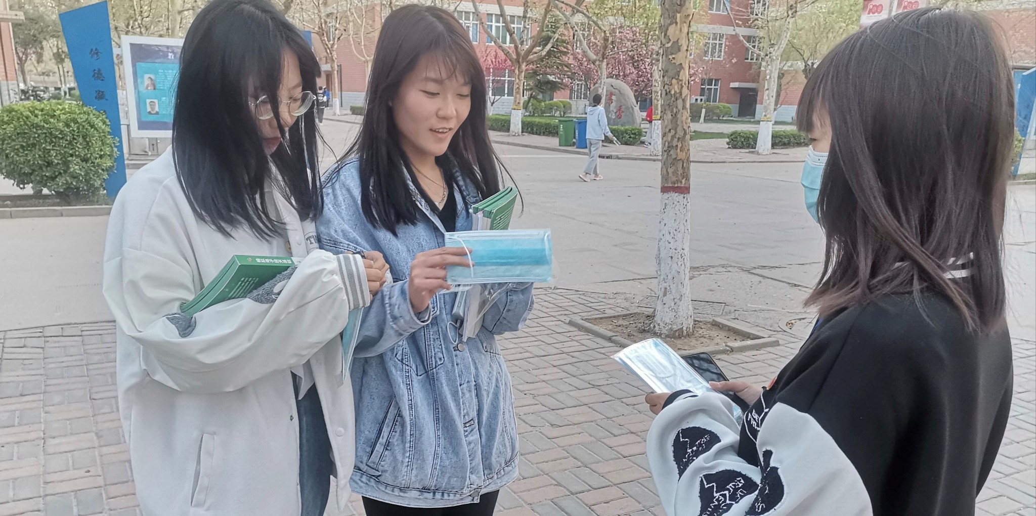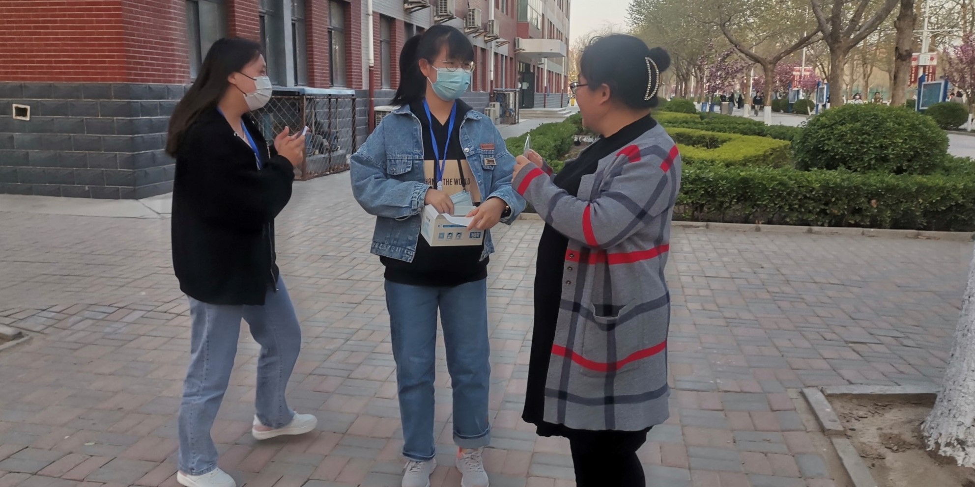 志愿者为未佩戴口罩的老师发口罩并获得老师点赞