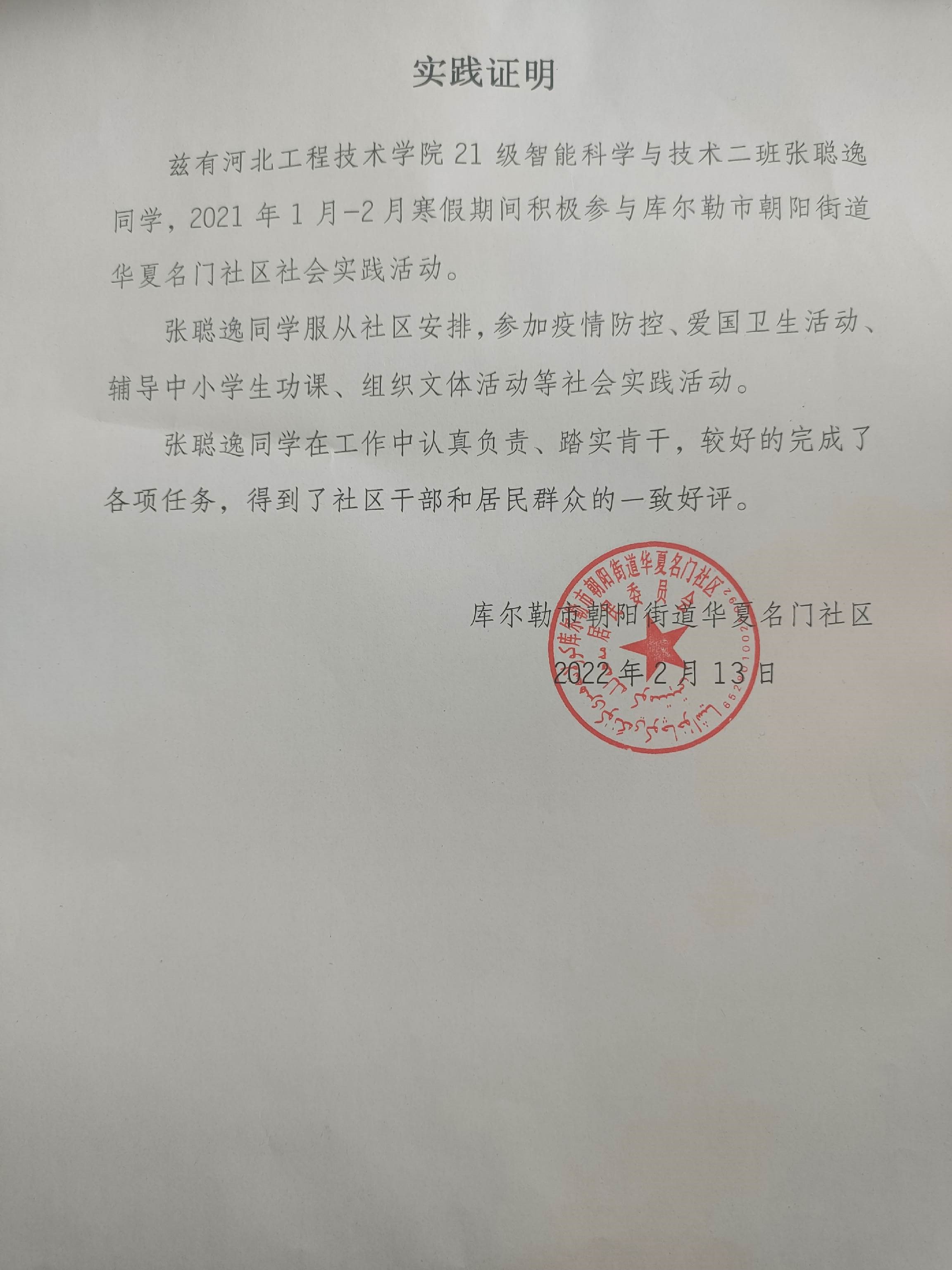 习近平总书记在给北京大学援鄂医疗队全体“90后”党员的回信中提到“青年一代有理想、有本领、有担当,国家就有前途,民族就有希望,让青春在党和人民最需要的地方绽放绚丽之花”。张聪逸同学作为一名老员工党员,深入学习贯彻习近平总书记对广大青年的五四寄语精神,尽自己的力量为家乡做贡献,于是在2022年寒假到来之际,参加了由新疆库尔勒市朝阳街道华夏名门社区组织的系列社会实践活动。